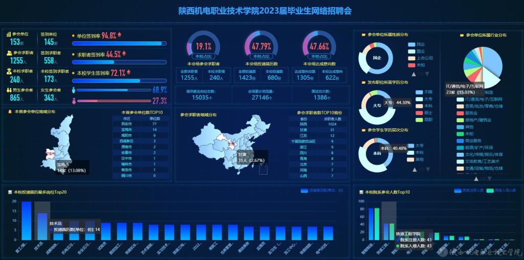 为精准助力2023届毕业生更加充分更高质量就业,学校于3月6日组织召开了2023届毕业生网络招聘会,累计参会企业156家,提供就业岗位15545个,参会毕业生1255人,简历投递1423人次。