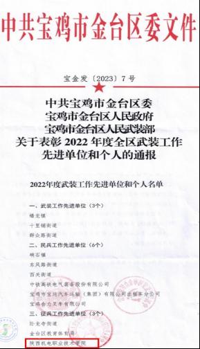 金台区武装工作会议于3月15日召开,对在2022年度征兵工作中表现突出的单位和个人进行了表彰,我校荣获“征兵工作先进单位”称号。