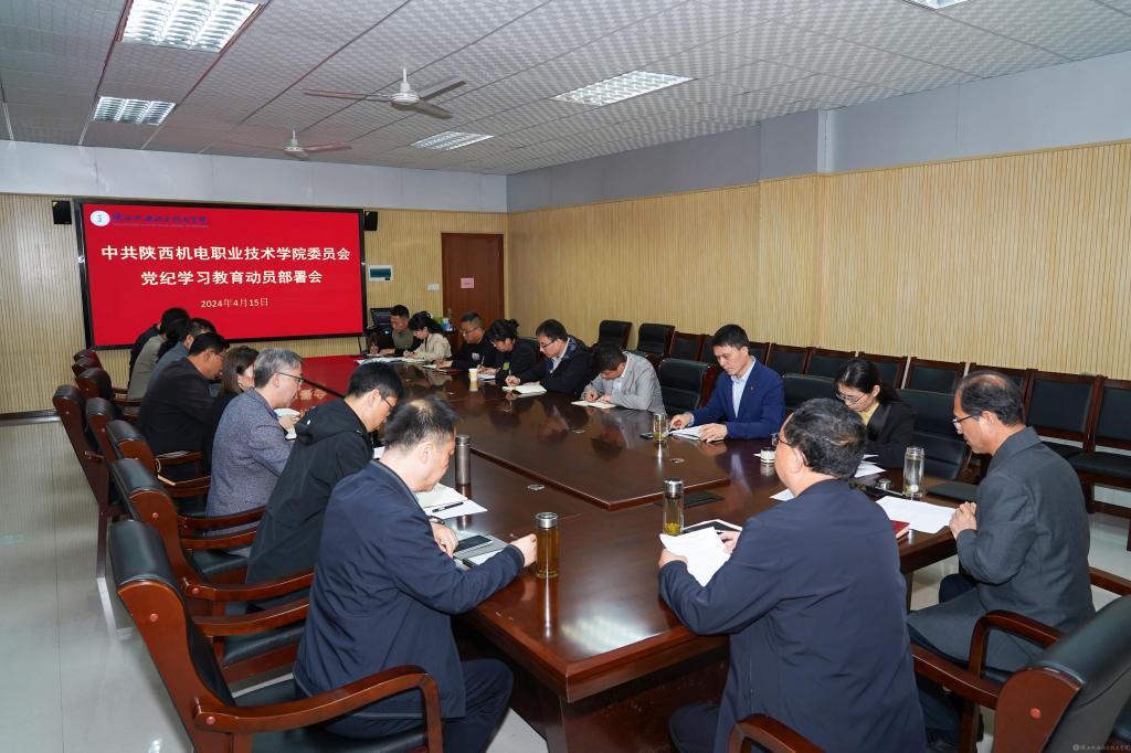 4月15日,陕西机电职业技术学院党委在蟠龙校区图书馆二楼会议室召开党纪学习教育动员部署会,审议通过《关于在全校开展党纪学习教育的实施方案》,校党委书记伊逊智主持会议并作动员讲话,校党委副书记、院长向纪明传达学习中央、省委党的建设工作领导小组会议精神,校党委委员、院长助理、党委组织部部长赵争东对全校党支部开展党纪学习教育有关工作进行安排部署,校党委委员、各党支部书记参加会议。